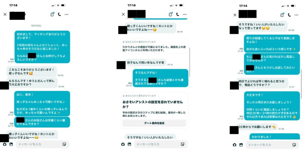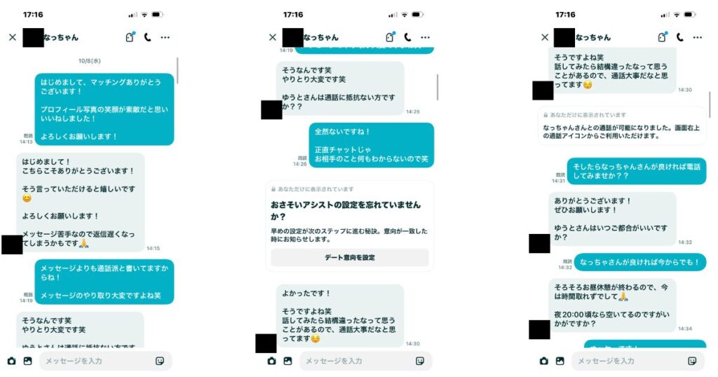 私: 「すごくわかります✨️ 〇〇さんと話すのとても楽しいので、少し電話で話してみませんか?カフェの話とかしてみたいです!」