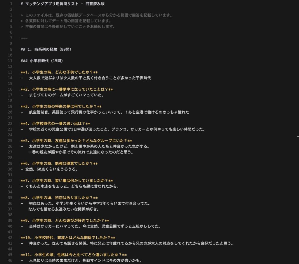初回デートって、お互いが探り合いをする場面なので、いかに減点されない回答をするかが肝になります。そのために、事前に自分の話を整理しておくんです。